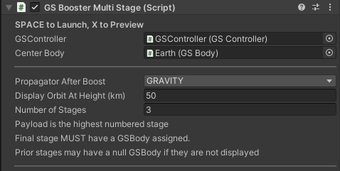 The GSMultiStageBooster acts a controller for the launch operation. When space is pressed it will launch the body.