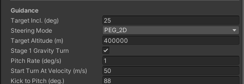 PEG_2DTarget Altitude (m): The target altitude for the desired circular orbitStage 1 Gravity Turn: Flag to indicate stage 1 should use a gravity turn guidance modePitch Rate (deg/s): Rate used to slew to the pitch kick indicatedStart Turn At Velocity (m/sspeed to attain before gravity turn startsKick to Pitch (deg.)the angle to pitch over to to start the gravity turn (90 is vertical)